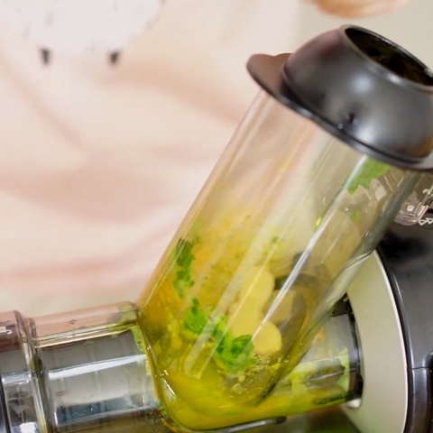Lần lượt bỏ theo thứ tự lá bó xôi, quýt, táo và gừng vào máy xay nhuyễn lấy nước.