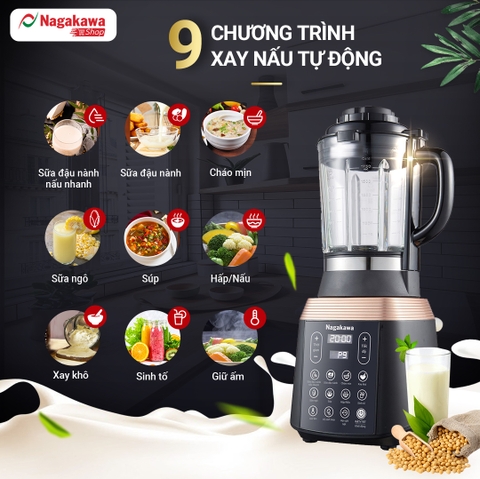 Máy làm sữa hạt Nagakawa NAG0815 là máy xay đa năng với 9 chương trình nấu được cài đặt sẵn , bao gồm : sữa đậu nành nấu nhanh , sữa đậu nành , súp đặc , cháo mịn , sữa ngô , hấp/ nấu , xay khô , sinh tố và chế độ giữ ấm . Các chương trình được cài đặt với thời gian và công suất phù hợp nhất với từng món ăn giúp giữ trọn hương vị , đảm bảo dinh dưỡng và chống trào khi nấu . Với tính năng Autoclean với một thao tác chỉ sau 2 phút máy bạn đã sạch hoàn toàn có thể dùng để chế biến món khác ngay mà không cần tự tay vệ sinh . Để đảm bảo an toàn cho người sử dụng máy Nagakawa NAG0815 còn được trang bị đế chống trượt bằng nhựa , giúp máy vững chải hơn khi nấu , tránh tiếp xúc với mặt ẩm ướt , tạo không gian cho quá trình tản nhiệt